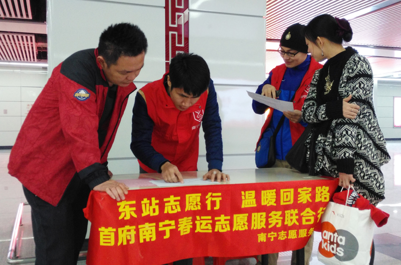 2月10日,建宁水务集团工会组织10名志愿者参加由市总工会组织的“东站志愿行、温暖回家路”南宁春运志愿服务联合行动。半天内,集团公司志愿者们共为180多名旅客提供指引、带路、咨询服务,并对不文明行为劝导10多起,为弘扬“奉献、友爱、互助、进步”的志愿服务精神,传递正能量作出了积极贡献。图为集团志愿者在为旅客提供指引道路咨询服务。(刘卫强 图/文)
