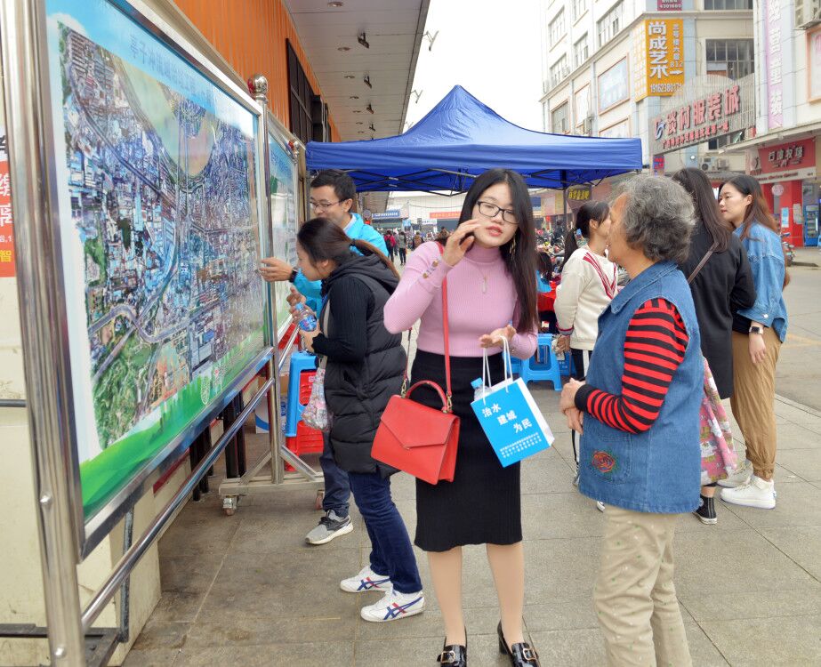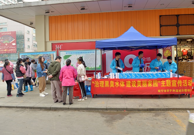 2019年11月21日上午, 南宁建宁水务集团与江南区政府在淡村市场联合开展“走进社区”黑臭水体治理主题宣传活动,据了解,此次活动主要以宣传江南区亭子冲流域治理工程(一期)项目黑臭水体治理效果展开,让广大市民进一步了解该项目黑臭水体治理情况,引导关注黑臭水体治理工作,提高水环境保护意识,自觉支持并参与黑臭水体治理工作,共享黑臭水体治理成果。