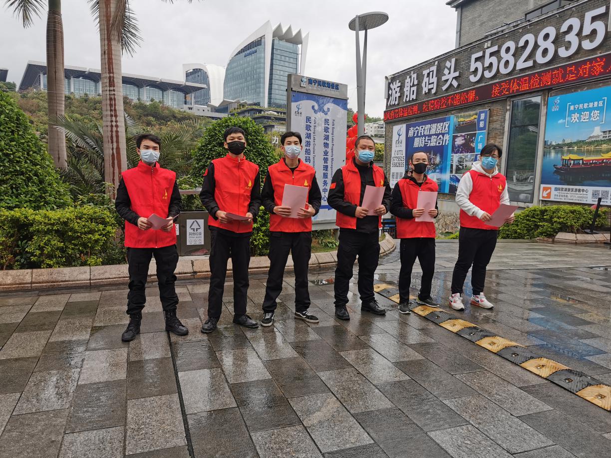 “疫情当前,好好待在家里,倡导健康的生活方式,加强自我防护,不聚会、少串门、多居家,就是我们对国家的贡献”。年青党员池永华带领党员志愿服务队深入民歌湖各商户,了解营业情况、进行疫情防控宣传,发放倡议书,劝导停车场外包服务人员少外出少聚会,在他的引导下,各商家全部主动暂停营业。