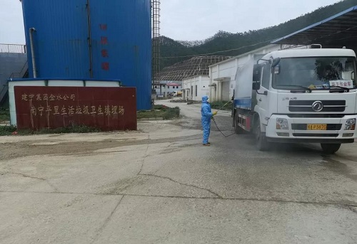 新冠疫情防控进入关键阶段以后,金水公司主动谋划,积极采取措施,克服人手缺少的困难,想办法压缩抽调人员,在平里生活垃圾卫生填埋场、三塘生活垃圾中转站和粪污处理中心处理站点入口设置垃圾运输车辆消毒站,按照《南宁市环卫行业疫情防控期间作业及设施病毒消杀规程》,采购配制次氯酸钠消毒液,对入站(场)垃圾运输车尾部、车轮、车身进行全方位喷洒消毒,严控垃圾运输车辆将新型冠状病毒带入站(场)和在垃圾运输途中扩散、传播,筑牢环卫垃圾运输车辆消毒防疫前线,保障环卫从业人员的身体健康。