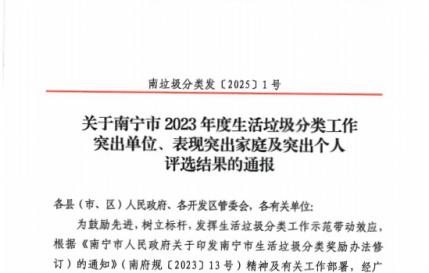 喜报!集团公司荣获2023年度南宁市生活垃圾分类工作突出单位
